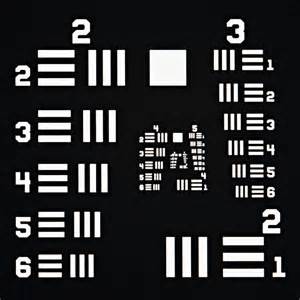 美國空軍1951年分辨力測試圖一直是世界上檢測垂直與水平分辨力的通用標準,是符合MIL-STD-150A標準的分辨力測試圖案,由美國空軍于1951年創(chuàng)建。1951 USAF分辨力測試圖目前仍廣泛地應(yīng)用于測試光學成像系統(tǒng)(如顯微鏡和相機)的分辨能力。這種圖案包括幾組由三條短線構(gòu)成組合,短線的尺寸從大到小。成像系統(tǒng)無法辯明的最大短線組為其分辨能力極限。