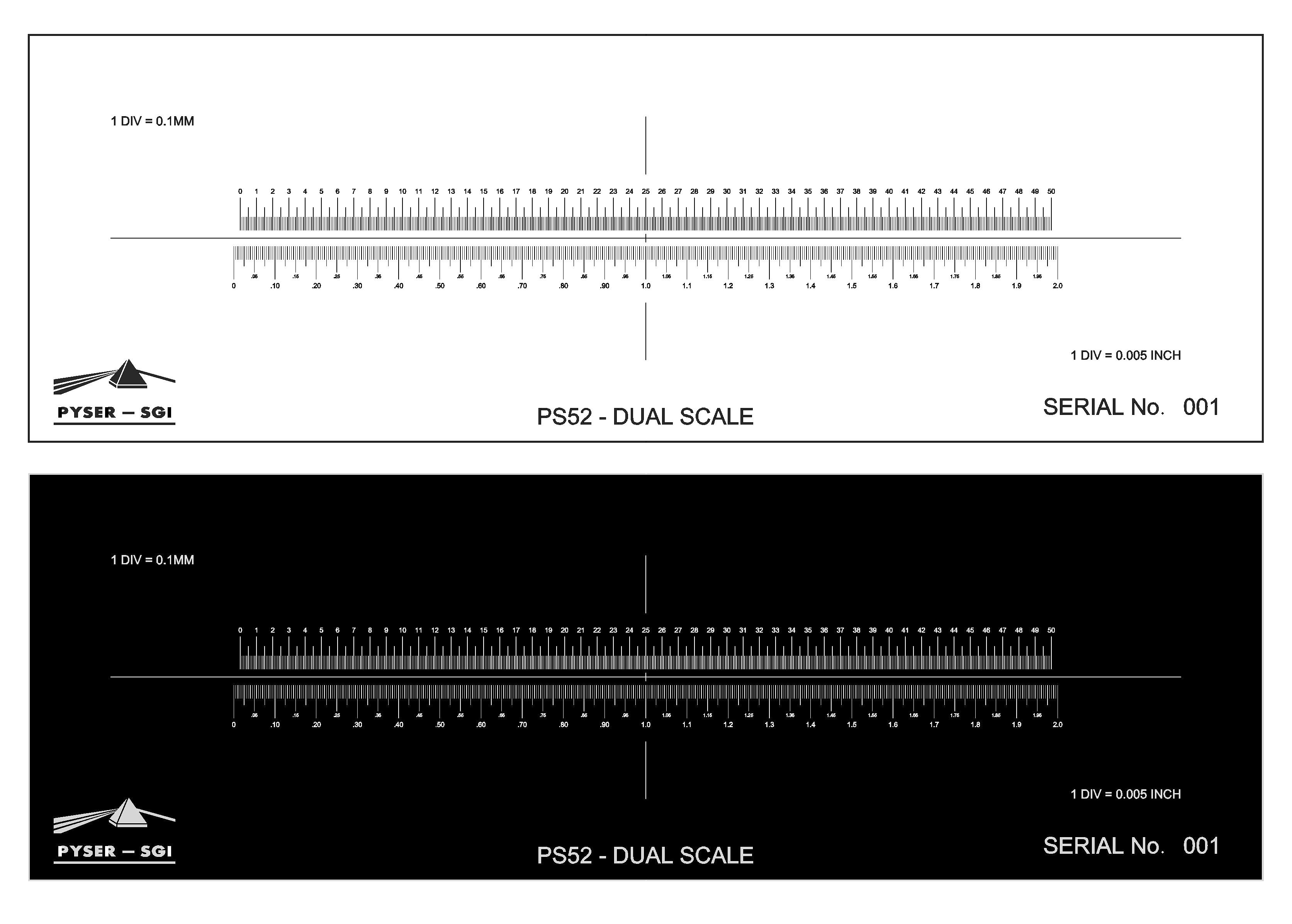 主要用于透射光照明的體視解剖顯微鏡,特別適合大視野范圍的操作或者拍照使用。標(biāo)準(zhǔn)的載玻片的外形,具有唯一產(chǎn)品序列編號可供追溯。同一玻璃尺刻度有英制和公制,正片(positive versions)和負(fù)片(negative versions)兩種便于客戶的選擇。產(chǎn)品的示意圖如下: