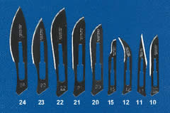 顯微外科解剖刀片,無菌獨立包裝,共有九種不同樣式,從右往左依次為10、11、12、15、20、21、22、23、24、25號,滿足您不同的實驗操作,訂購時需要指明幾號刀片。