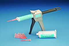 Sylgard 184硅橡膠(Kwik-Gard™Start Up kit)特別適合科學(xué)研究應(yīng)用??梢允∪セ旌蟽煞N膠帶來的麻煩和時間的浪費。當(dāng)推進注射器時自動在尖部混合,無任何氣泡,直接用于位點。更換尖端就可以重復(fù)使用,有效避免了浪費。每針筒含有37ml的硅膠樹脂和固化劑,針筒頭(tip)的體積0.75ml。針筒內(nèi)的硅橡膠是Sylgard 184,液體組分組成的雙組分產(chǎn)品,包括硅膠組分與固化劑。硅膠組分與固化劑按10:1重量比完全混合,形成中等粘度混合液,混合液將固化成為具有韌性的透明彈性體,硅橡膠在25℃的溫度固化需要24h,無放熱現(xiàn)象,無需二次固化。