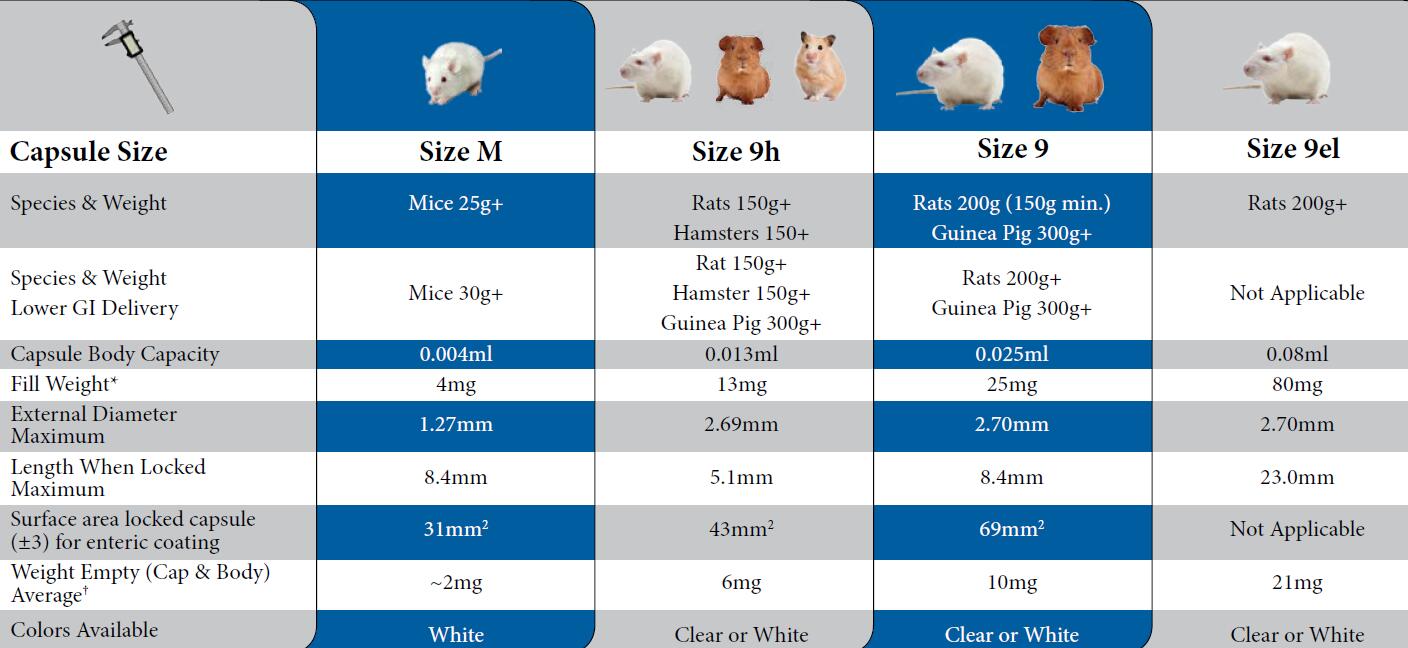 小動(dòng)物專(zhuān)用膠囊根據(jù)使用對(duì)象的個(gè)體大小分為四個(gè)級(jí)別:9el號(hào)、9號(hào)、9H和M號(hào)。9號(hào)適用于大鼠(體重150g以上)和豚鼠;M號(hào)適用于體重大于30g的小鼠。另外,9號(hào)還適用于大鼠(200g-250g)的肛腸給藥(是不是也要考慮包衣問(wèn)題?)??紤]到9el號(hào)膠囊太大,不適合腸溶,就不給出包衣的指導(dǎo)面積了。