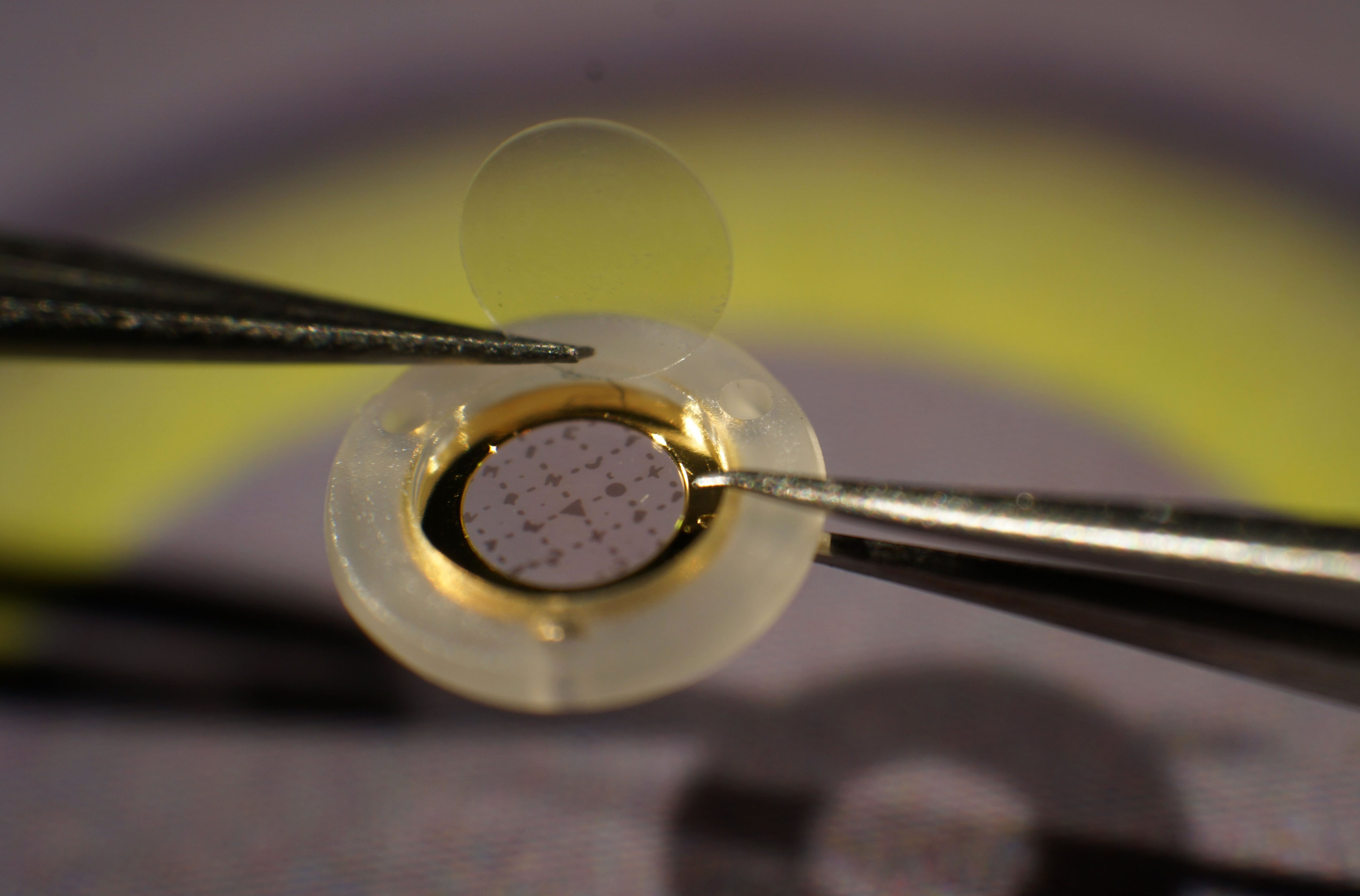 這是專門為萊卡高壓冷凍儀HPM100設(shè)計的一款樣本準備工具,整體類似一個小型培養(yǎng)皿。首先在藍寶石圓片(載物作用)上置一個50微米厚度的黃金圓環(huán),外夾環(huán)形塑料片,具體的樣子見下圖。樣本置于載物作用的藍寶石圓片上,再覆一個蓋片,蓋片也是藍寶石圓片,可以簡單地把樣本封在兩個藍寶石圓片之間,樣本艙置于一個特殊的特殊的適配器內(nèi)(HPM100,HPM010,HPF COMPACT O2儀器均有這樣的適配器)?;罴毎惖臉颖驹谶M入高壓冷凍儀之前在這個樣本艙內(nèi)可以直接在光鏡下觀察呈像。從高壓冷凍儀內(nèi)出來,進一步進行冷凍替代和常溫切片。